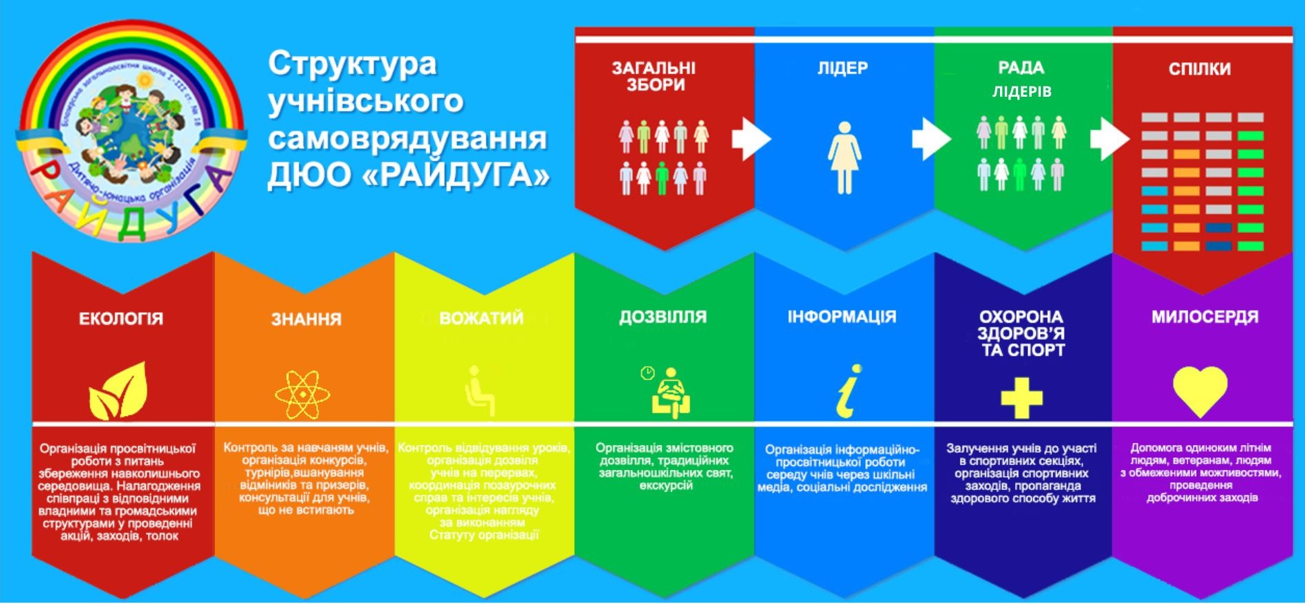Учнівське самоврядування дитячо-юнацької організації “РАЙДУГА” сприяє розширенню діапазону діяльності дорослих і дітей – членів єдиного колективу, можливості їх співдружності, творчому пошуку, ініціативи. Становлення організації проходить на демократичній основі.