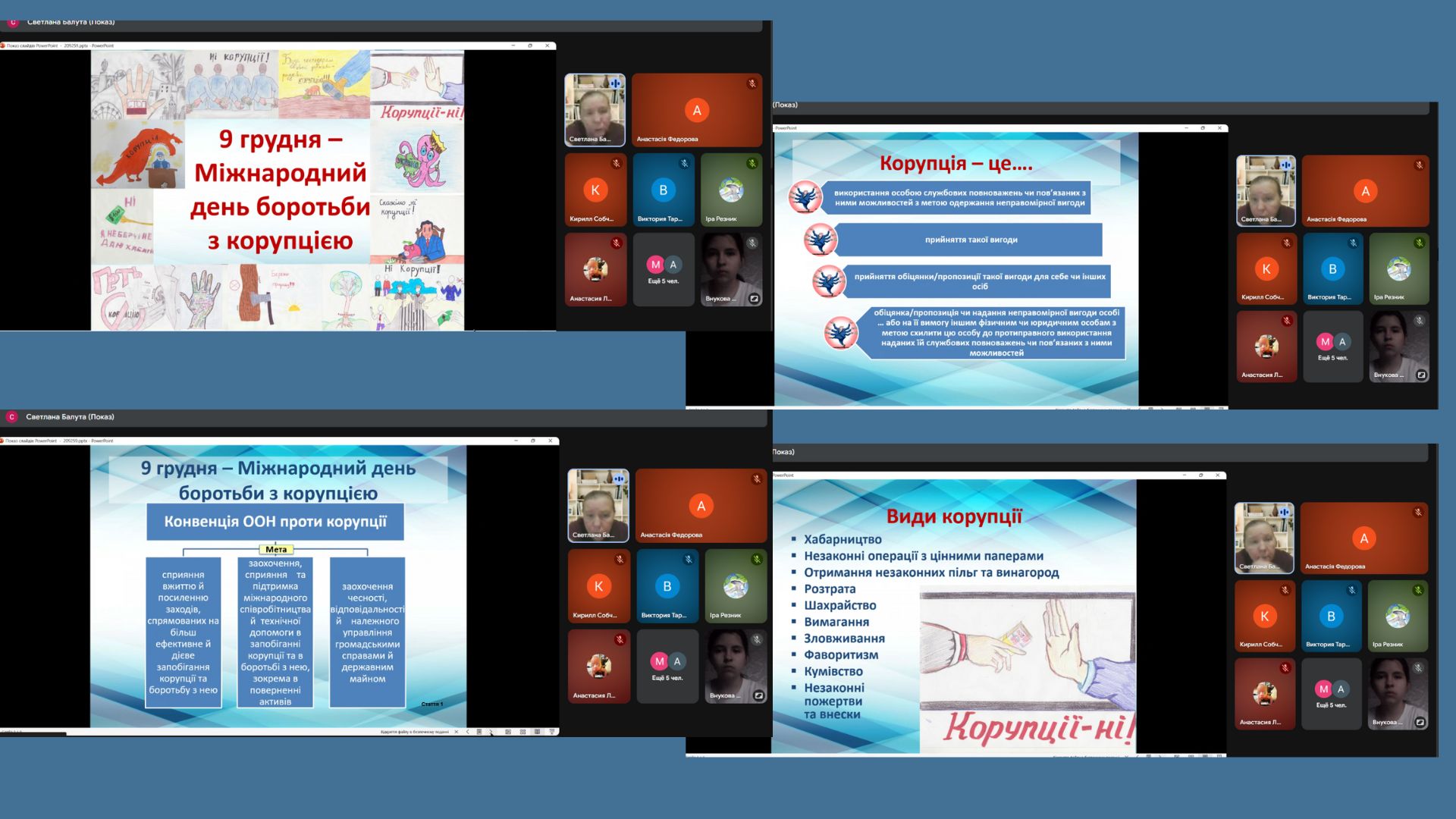 Починаючи з 2004 року 9 грудня у світі щорічно відзначається Міжнародний день боротьби з корупцією. Корупція – це загроза, яка підриває довіру до держави, послаблює інституції та заважає розбудові сильної України. Державою активно впроваджуються цифрові інструменти для надання адміністративних послуг, які виключають людський фактор та мінімізують корупційні ризики. Завдяки електронним сервісам та автоматизації робочих процесів ми можемо надавати послуги громадянам швидко та якісно. З метою сформувати в учнів уявлення про соціальне явище корупції та шкоду, яку корупція завдає персонально конкретній людини в Білозерській загальноосвітній школі І-ІІІ ступенів №18 Білозерської міської ради проведені наступні заходи: інформаційна хвилинка “Міжнародний день боротьби з корупцією”, антикорупційна гра “«(Не)підкупність»”, квест “Антикорупційний урок».