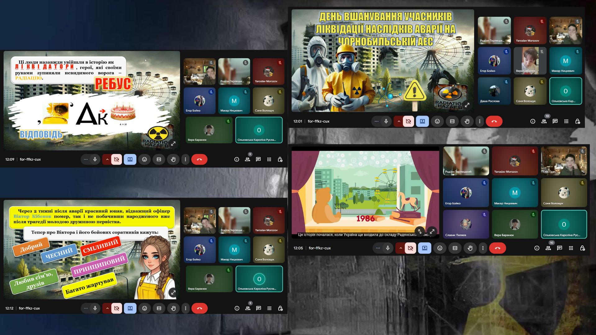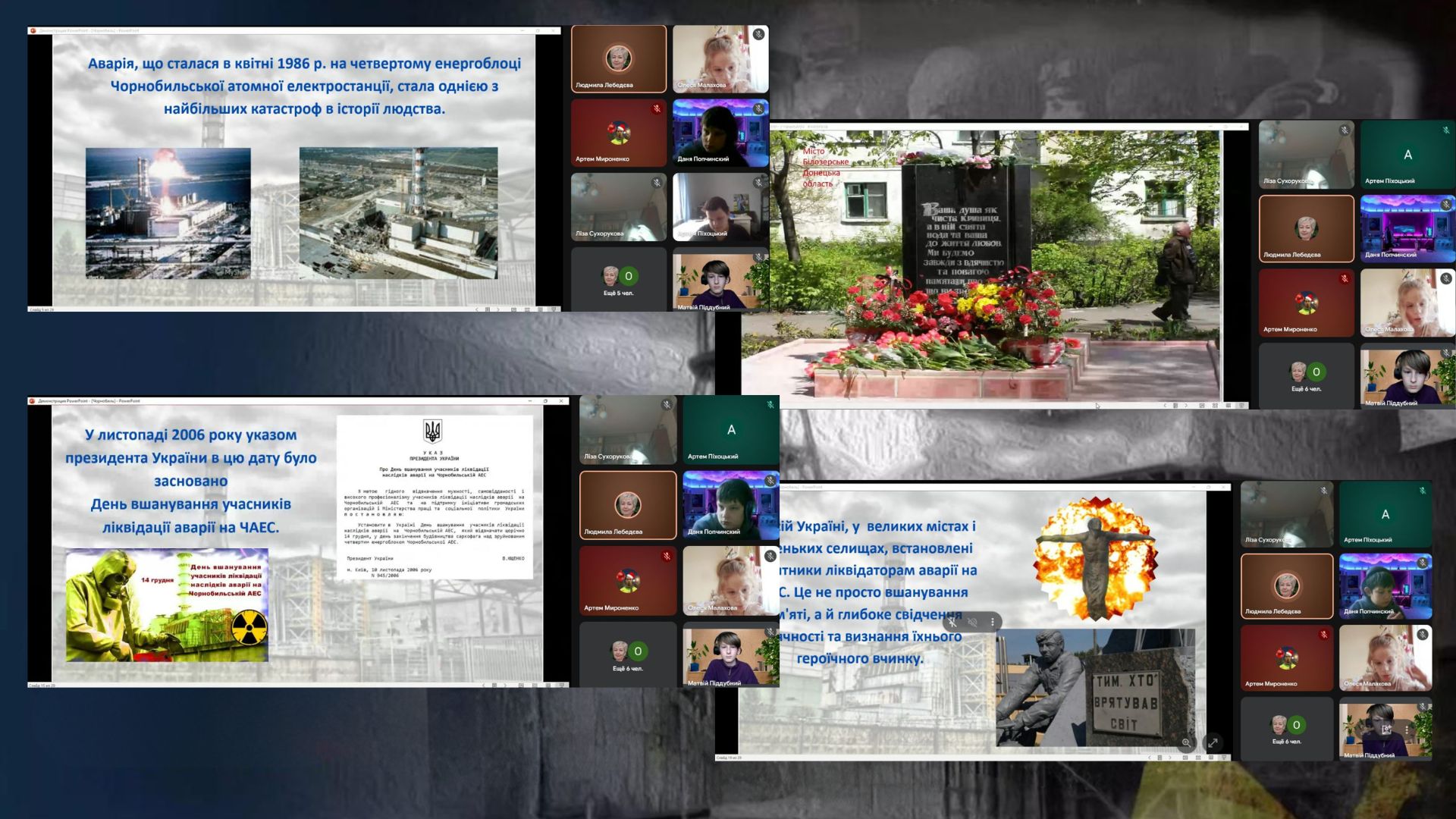 Щороку 14 грудня Україна вшановує мужність і самопожертву людей, які першими стали на захист людства від наслідків техногенної катастрофи світового масштабу — аварії на Чорнобильській атомній електростанції.Для ліквідаторів ті події назавжди залишилися не просто сторінкою історії, а особистим досвідом, який став випробуванням сили духу, відданості та професійної честі. Саме завдяки їхній тяжкій і небезпечній праці вдалося зупинити розповсюдження радіації, локалізувати наслідки вибуху та врятувати життя мільйонів людей.З метою розповісти учням про трагедію на Чорнобильській атомній електростанції та її наслідки, про масштаби катастрофи; дати уявлення про норми поведінки в умовах надзвичайних ситуацій; виховувати почуття гордості за український народ, викликати співчуття до інших людей, вчити достойно оцінювати їх внесок у життя країни в Білозерській загальноосвітній школі І-ІІІ ступенів №18 були проведені заходи: інформаційні хвилини «Чорнобиль- загублений світ!», “Герої Чорнобиля: подвиг і пам’ять”, інтерактивна онлайн-екскурсія з елементами гри та рефлексії “Віртуальна подорож у часі: Чорнобиль”
