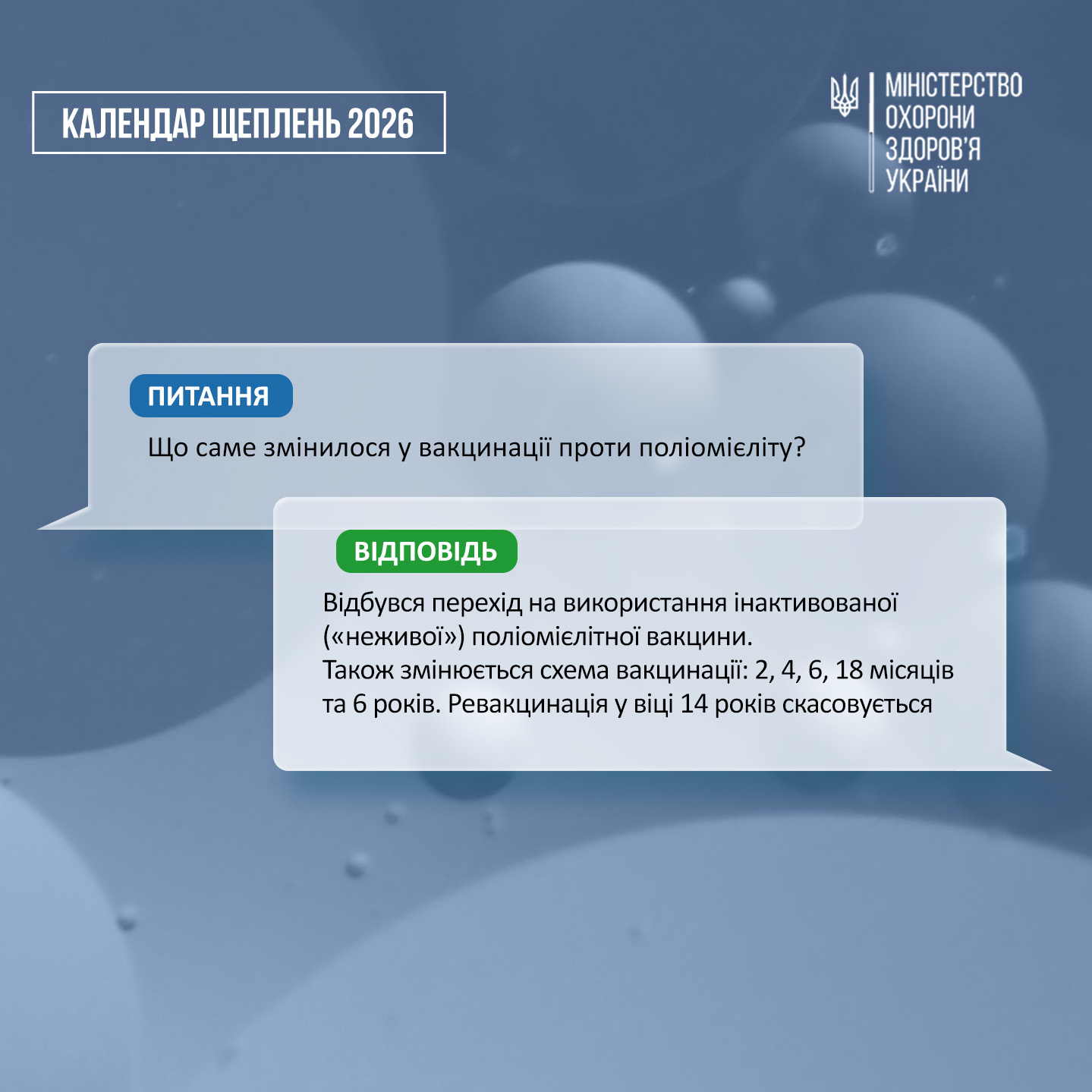 Відбувся перехід на використання інактивованої («неживої») поліомієлітної вакцини, оральна поліомієлітна вакцина (ОПВ) більше не застосовуватиметься.Також змінюється схема вакцинації. Тепер вона складається з 5 щеплень, які проводяться у віці 2, 4, 6, 18 місяців та 6 років. Ревакцинація у віці 14 років скасовується.