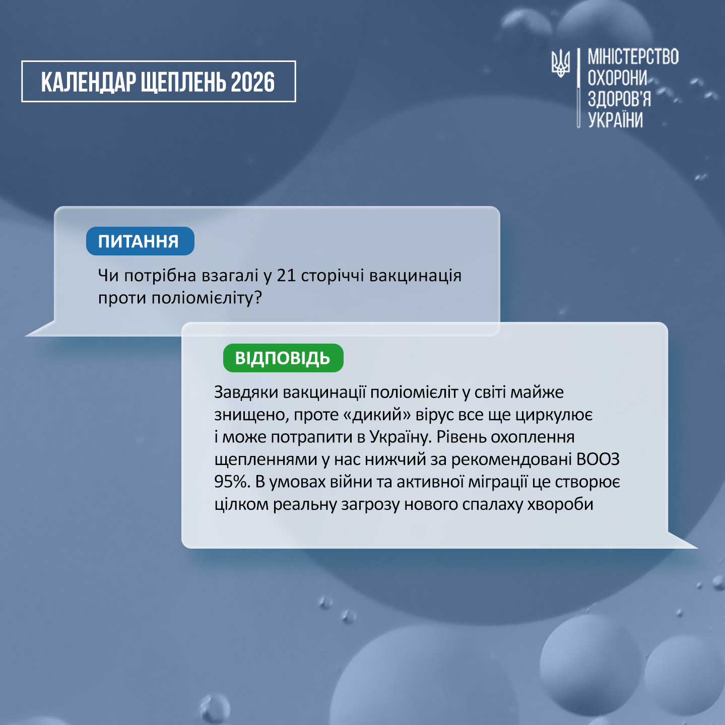 Кількість випадків захворювання на поліомієліт справді впала на рекордні 99% з 1988 року. З трьох типів «дикого» поліовірусу на сьогодні два оголошено викоріненими — це сталося завдяки масовій вакцинації. Проте у двох країнах світу «дикий» вірус поліомієліту все ще циркулює, тому існує ризик «завезення» його в інші країни.  До тих пір, поки у світі циркулює будь-де вірус поліомієліту, будь-яка дитина без вакцинації має ризик захворіти на цю інфекцію. Рівень охоплення щепленнями в Україні не досяг рекомендованого ВООЗ рівня у 95%, що могло б в певній мірі захистити невакцинованих. Тож в умовах війни, коли руйнується інфраструктура, наявна сильна внутрішня міграція населення, новий спалах цілком можливий.