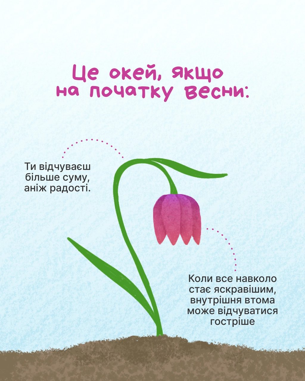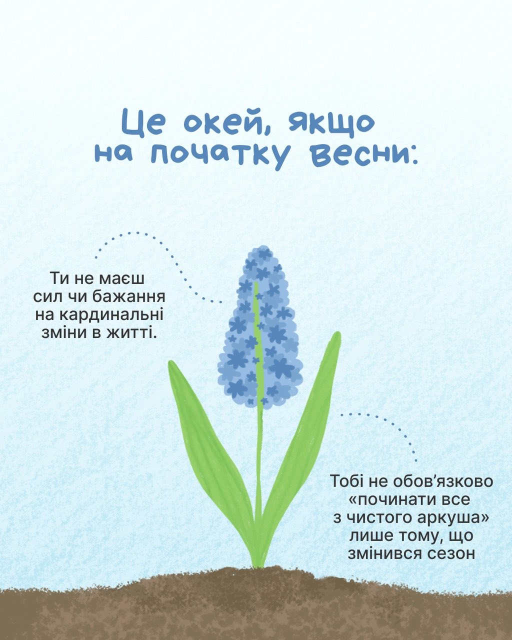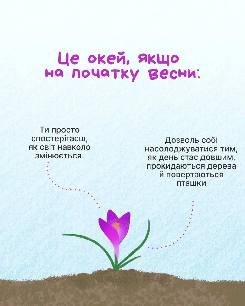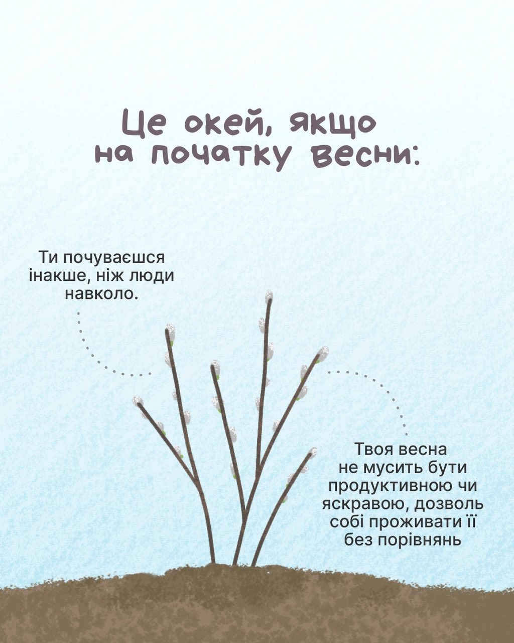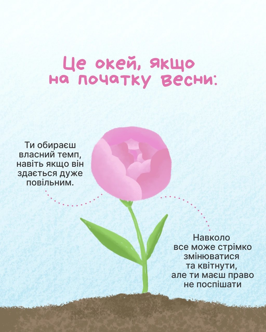 Зміна сезонів — насправді чудовий час. Проте твій внутрішній стан може не збігатися із календарем, і це нормально. Якщо зараз відчуваєш втому чи просто хочеш проводити більше часу вдома наодинці із собою, ти не «пропускаєш» весну, а дбаєш про себе. Дозволь собі просто бути, у будь-якому стані, темпі та настрої.