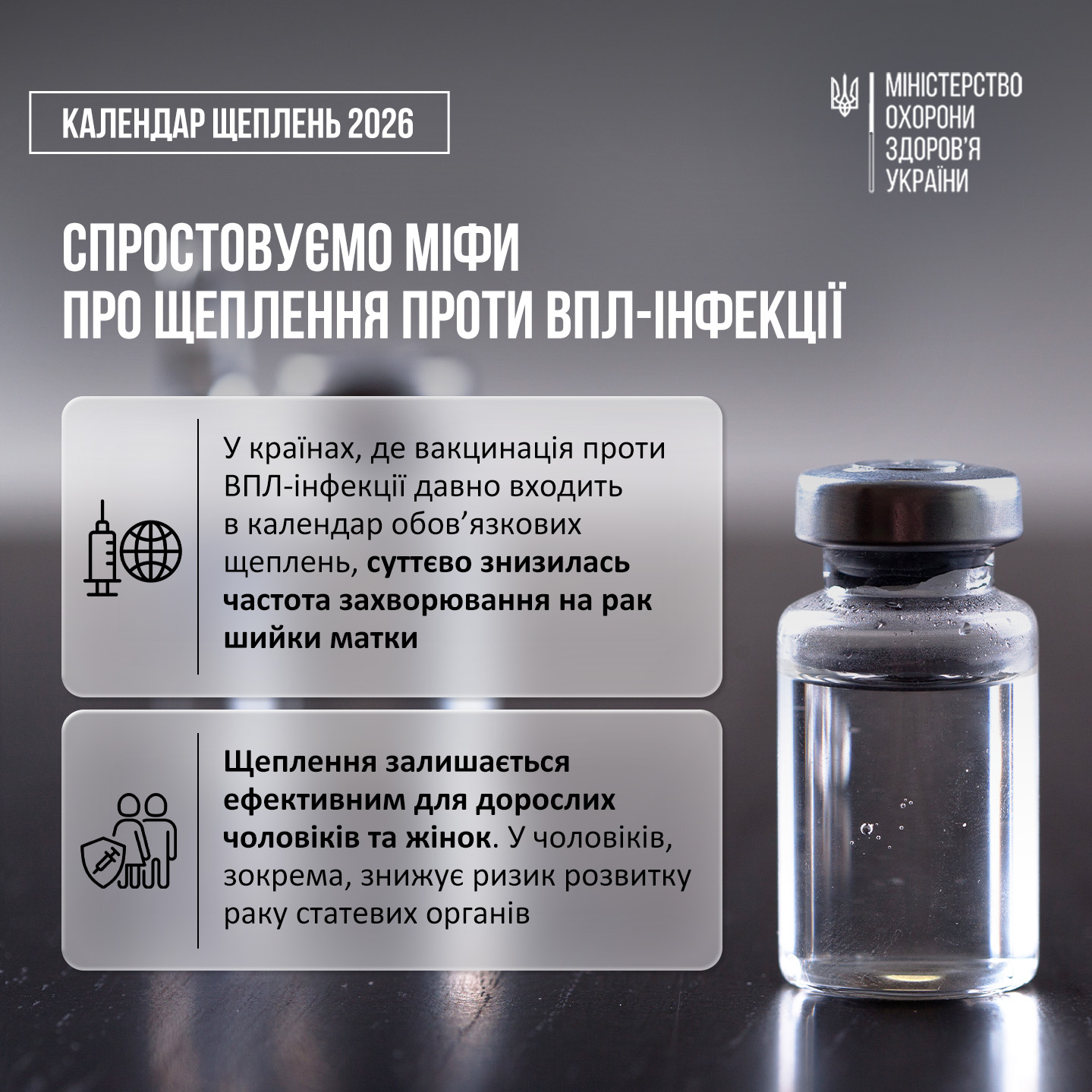 Продовжуємо розповідати про щеплення проти ВПЛ-інфекції, яке з’явилося у новому Національному календарі профілактичних щеплень. Точніше, у цьому дописі розвінчуємо міфи разом з Веронікою Пацко, лікаркою-онкологинею, завідувачкою відділення клінічної онкології Національного інституту раку. Чи призводить вакцинація проти ВПЛ-інфекції до раку?  Немає жодних достовірних даних щодо частішої появи злоякісних пухлин у вакцинованих, ніж у невакцинованих, а вакцинація від ВПЛ є безпосередньою профілактикою деяких злоякісних новоутворень. Зокрема, в країнах, де щеплення проти ВПЛ-інфекції  давно входять до календаря обовʼязкових щеплень (Австралія, Велика Британія, Швеція, Тайвань тощо), суттєво знизилася частота захворювання на рак шийки матки. Ця вакцина погано вивчена, тож невідомо, які наслідки будуть після вакцинації, чи не так?  Вперше вакцини від ВПЛ-інфекції почали використовувати ще в 2006 році (20 років тому), тому певні висновки вже можна робити. Наразі єдиним очевидним ефектом є суттєве зниження захворюваності на рак шийки матки та інші ВПЛ-асоційовані захворювання в країнах, де така вакцинація є рутинною процедурою. Навіщо вакцинуватися проти ВПЛ-інфекції, якщо у мене немає багато статевих партнерів?  Поширеність ВПЛ дуже висока — троє з чотирьох людей інфікуються протягом життя незалежно від кількості статевих партнерів.  Чоловіків і дорослих не потрібно вакцинувати проти ВПЛ-інфекції, правда? ВПЛ викликає у чоловіків рак статевих органів, анального каналу,  а також кондиломи. Крім того, чоловіки є носіями вірусу, тож їхнє щеплення необхідне для колективного імунітету.Вакцинація дієва для дорослих. Хоча найкращий захист досягається до початку статевого життя, у дорослому віці щеплення знижує ризик захворювань на понад 80%.